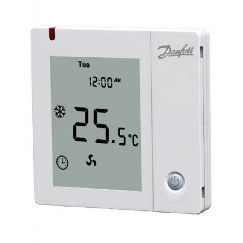 Электронный программируемый термостат, программирование по дням недели. Для применения в четырехтрубных системах отопления/охлаждения фэнкойлов. Трехпозиционное переключение скорости вентилятора. U = 230 В, I = 3(1) A.