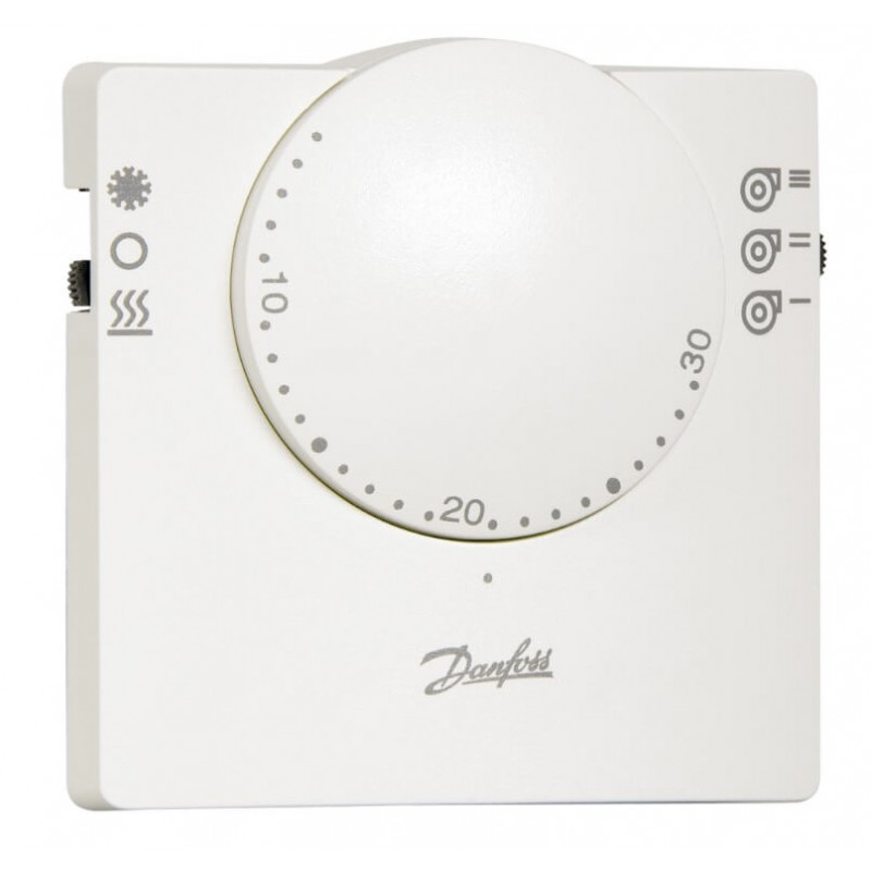 Комнатный термостат для применения в двухтрубных системах отопления/охлаждения фэнкойлов. Оснащен LED-индикатором, переключением режима Охлаждение/Отопление и трехпозиционным переключателем скорости вентилятора.