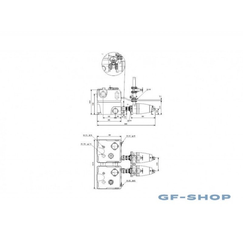 Канализационная насосная установка Grundfos MD1.80.100.40.4.51D/450-2.SE - компактная канализационная насосная станция для сточных вод состоит из одного или двух баков объемом 450 л, двух горизонтальных погружныех насосов серии SE для сточных вод, вкл.контроллер, аналоговый датчик уровня и возможность подключения принадлежностей. Бак на 450 л изготовлен из герметичной, коррозионно стойкого полиэтилена и не пропускает газы и запахи. Он снабжен: Тремя горизонтальными входными патрубками DN150 с одинарным уплотнением, Вертикальными входными соединительными патрубками DN 100, Вертикальными соединительными патрубками DN75 с гибкими штуцерами и зажимами для вентиляции. Два горизонтальных соединительных патрубка DN40 с соеденительной частью и зажимом для ручного мембранного насоса (принадлежность). Бак специальной формы внутри разработан и запатентованной для того, чтобы избежать осаждения грязи и уменьшения количества остаточной воды. Для использования дополнительной накопительной емкости предусмотрены 4 соеденительных патрубка DN150 размещенных по бокам. Горизонтальные насосы для сточных вод с одноканальным рабочим колесом или рабочим колесом типа Vortex в соответствии с запросом Свободный проход до 80 мм для надежной работы без заклинивания Уникальная система зажимов для демонтажа гидравлической и моторной части в течение одной минуты, Водонепроницаемый кабельный разъем из нержавеющей стали для легкого технического обслуживания и ремонта, Двойные картриджные уплотнения вала для легкого технического обслуживания и ремонта, - электродвигатель с тепловым выключателем внутри обмотки Запатентованная система охлаждения для непрерывной работы насосов типа SE Электродвигатель с тепловым выключателем внутри обмотки Запорные клапаны, обратные клапаны, выпускные патрубки, ручного диафрагменного насоса, болты и прокладки, а также 450-литровый бак доступны как принадлежности LC221 контроллер с микропроцессором оснащен дисплеем для полного мониторинга. Насос и датчик подключены к контроллеру с 4 м или 10 м кабелем и трубой. Кабель питания 1,5 м с вилкой (с фазоинвертором для 3-х фазный двигатель) Бесконтактный, пьезо-резистивный датчик давления подключаемый внутри шкафа, контролируется контроллером и с точностью до миллиметра отображается на дисплее. Защита от блокировки трубки давления внутри резервуара без движущихся частей внутри сточных вод. Контроллер для тепловой защиты электродвигателя и контроля работы насоса. Тепловая защита двигателя состоит из температурного датчика-выключателя в обмотке. Функции контроллера: Пуск / дельта операция для насосов> 5кВт Включение / выключение, регулярные и ошибки переключения двух насосов сточных вод на основе непрерывного сигнала с пьезо-резистивный датчика Защита электродвигателя с помощью выключателя защиты и / или измерения тока, а также подключения тепловых реле. Защита электродвигателя от работы «всухую» во время выполнения ограничений в случае аварийного режима 24ч автоматический тестовый режим работы в течение длительного периода бездействие установка времени простоя (отложенного пуска): Отмена останова (времени простоя насоса, после того, как будет достигнут уровень останова) Отложенный пуск (время между достижением уровня пуска насоса и фактическим началом пуска насоса) Задержка между сигнало