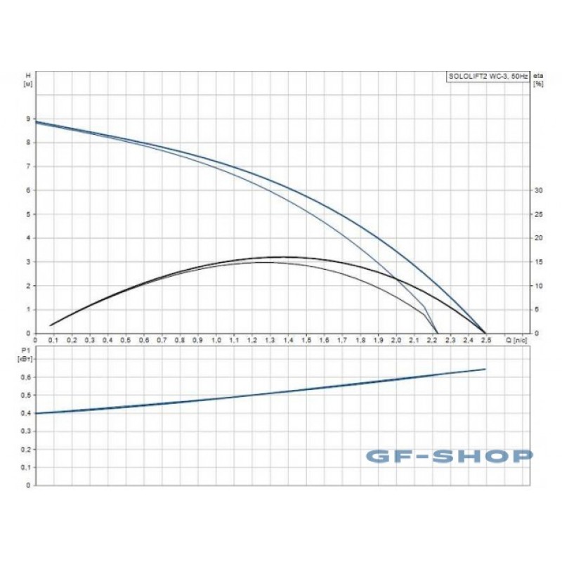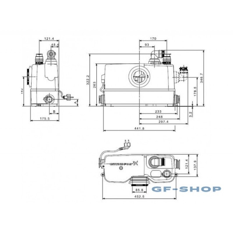 Канализационная насосная установка Grundfos SOLOLIFT2 WC-3 это малогабаритная, полностью укомплектованная и готовая к монтажу установка, представляет собой герметично закрытый пластиковый резервуар в котором расположены - насос с двигателем “сухого исполнения” с обратным клапаном в напорном патрубке, профессиональный режущий механизм и мощный двигатель способные справиться даже с предметами личной гигиены (WC-1, WC-3, CWC-3), реле уровня, вентиляционный клапан с угольным фильтром улучшенного качества (не требуются никакие дополнительные фильтры), электрический кабель длиной 1.2 м со штекером Shuko. Насос автоматически включается при заполнении резервуара (уровень включения) и автоматически выключается при его опорожнении (уровня выключения). Sololift2 WC-3 подходит для перекачивания сточных вод из туалетов, в которых содержится туалетная бумага и фекалии, дополнительные соединения на крышке и боковых поверхностях емкости, позволяют подключить, например, умывальник, душ или биде. Перекачивание жидкостей, в которых содержатся другие включения, может привести к отказам и ограничению гарантии. Sololift2 WC-3 обычно используется для откачки воды от: