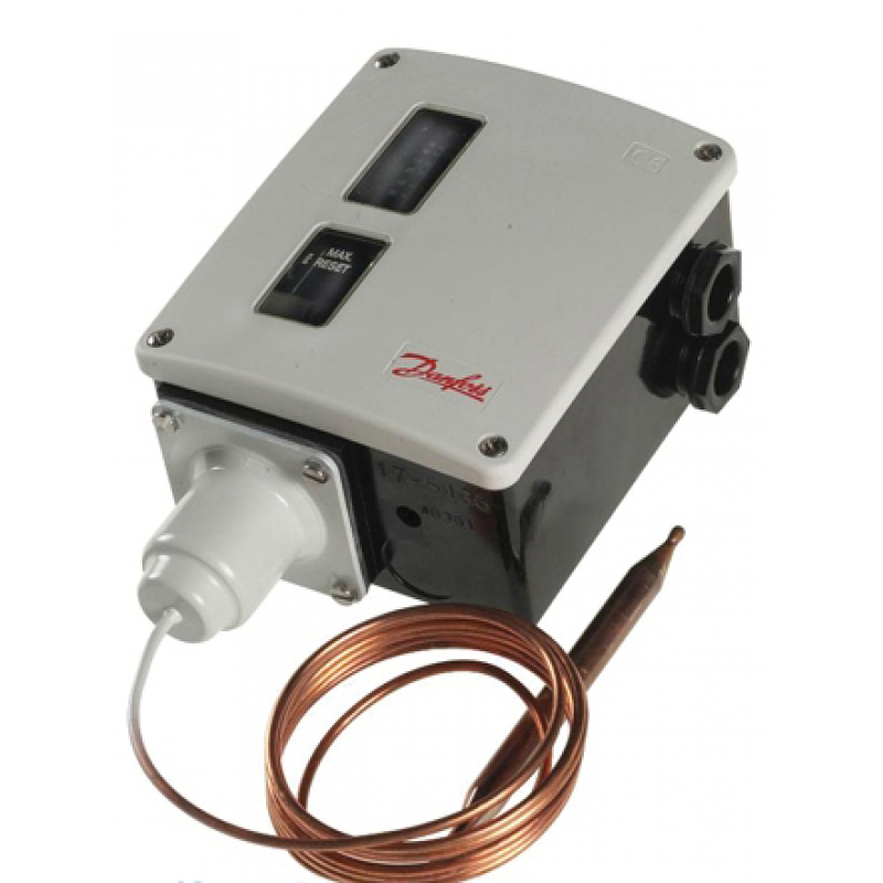 Реле температуры для тяжелой промышленности RT 123, диапазон 150-250 °С, дифференциал 1,8 - 30 °С, IP66 (стандартно) или IP54 для реле с блокировкой контактов, температура окружающей среды: от -50 до +70 °C, длина капиляра 2 м.