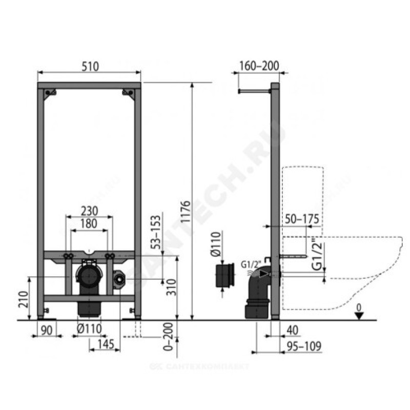| Комплект поставки | Самонесущая рамаМонтажный комплект: винт ?8?60 – 4 шт., дюбель ?12 – 4 шт.Монтажный комплект для крепления унитаза: шпилька М12 – 2 шт., шайба – 4 шт., колпачок – 2 шт., гайка – 2 шт., гофрированный рукав – 2 шт.Стоковое колено из полипропилена ?90/110, комплектРезьбовое соединение для подключения воды: G1/2"–G1/2" |