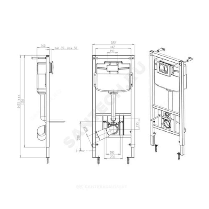 | Комплект поставки | металлическая рама с нижними и верхними крепёжными стойка 1 комплект; пластмассовый смывной бачок в сборе (без кнопочного комплекта) 1 комплект; комплект переходных трубок 1 комплект; комплект крепления инсталляции 1 комплект; заглушка для трубы 50 мм 1 штука; заглушка для трубы 110 мм 1 штука; картонный короб 1170х160х570 мм 1 штука; паспорт 1 экземпляр; кнопка смыва |