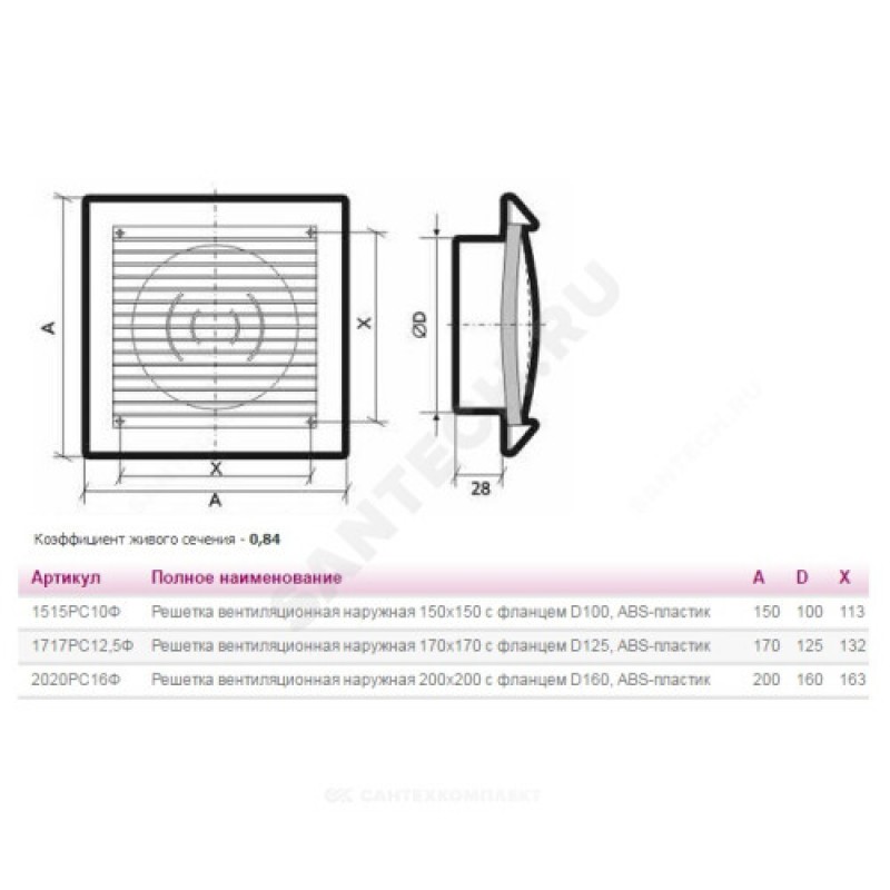 | Наименование производителя | Решетка вентиляционная приточно-вытяжная АБС 150х150 с фланцем D100, 1515РС10Ф |