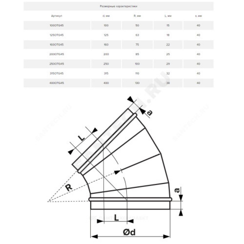 | Наименование производителя | Отвод, серия OTG, для круглых воздуховодов на 45°, D250, оцинкованная сталь |