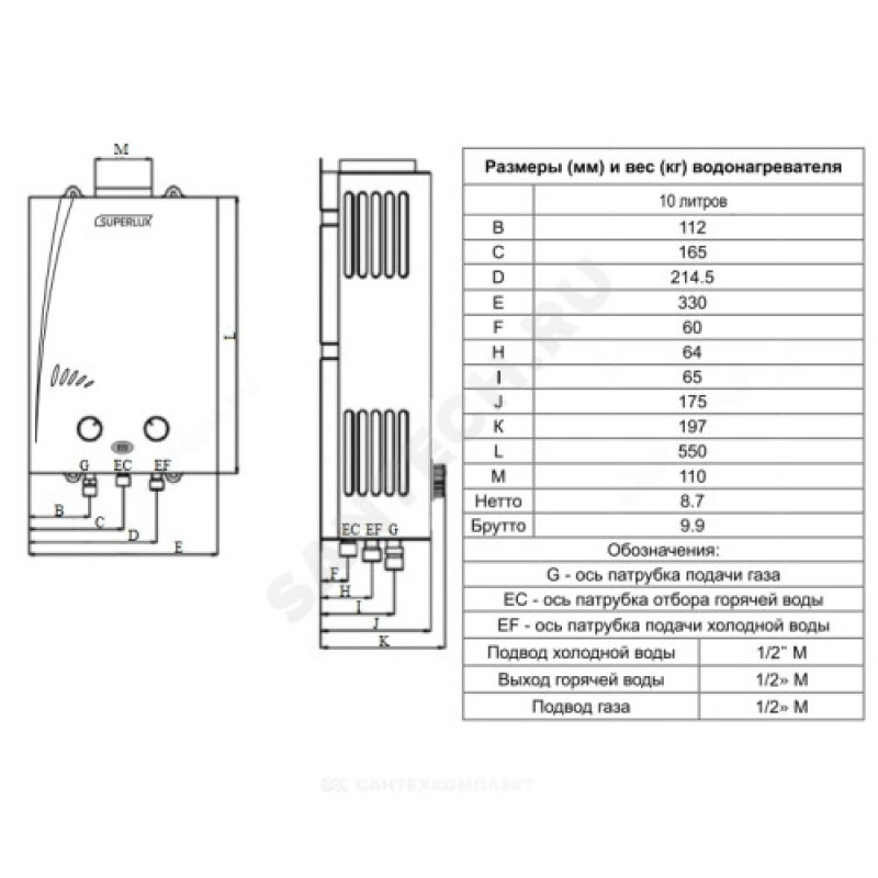 | Выход горячей воды | 1/2" |